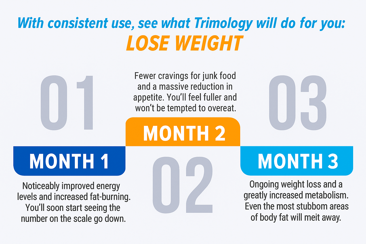 An overwhelming number of users who took Trimology as directed experienced a dramatic reduction in their overall body weight, appetite cravings, and belly fat, and experienced a significant increase in their metabolic rate, energy, and vitality – IN ONLY 4 WEEKS!
